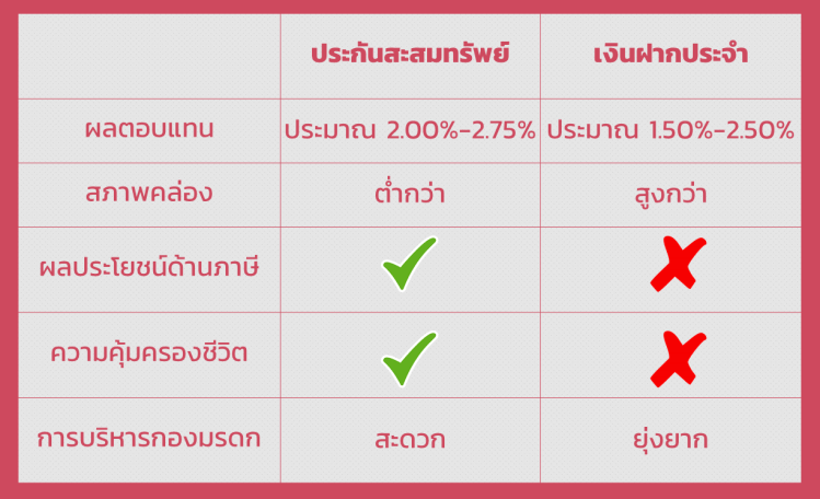 - ถ้าเราอยากออมเงินระยะสั้น มีสภาพคล่องสูงหน่อย ก็เลือกเงินฝากประจำ แต่ถ้าเราอยากได้ความคุ้มครองชีวิตและผลประโยชน์ทางด้านภาษี ประกันสะสมทรัพย์ก็อาจจะเป็นตัวเลือกที่น่าสนใจมากกว่า