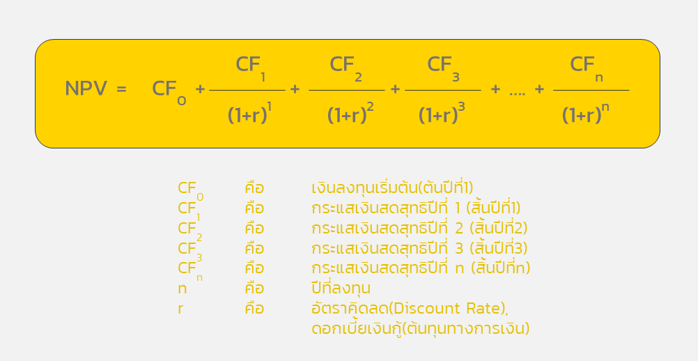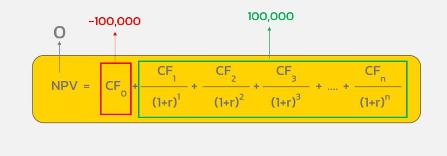 ลองคิดตามดูดีๆ จะเห็นว่า ถ้าตัวเลขสองก้อนนี้มันเท่ากัน ก็จะทำให้ NPV มีค่าเท่ากับ ศูนย์ นั่นเอง (อย่าลืมว่า CF0 เป็นเงินลงทุนตอนแรก ซึ่งกระแสเงินสดจ่ายออก ตัวเลขติดลบอยู่ดี)
