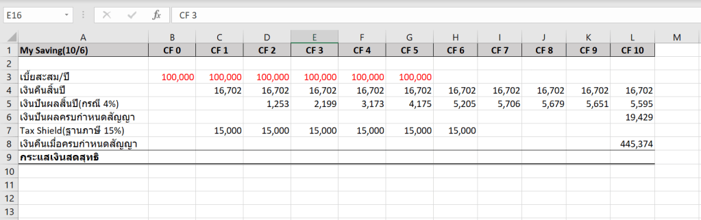 เบี้ยสะสม คือ เงินที่เราสะสมกับบริษัทเป็นระยะเวลา 6 ปี (อย่าลืมใส่เครื่องหมายลบหน้าตัวเลขด้วยนะค้า)