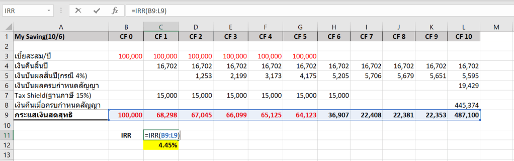 =IRR(กระแสเงินสดสุทธิCF0:กระแสเงินสดสุทธิCF10)