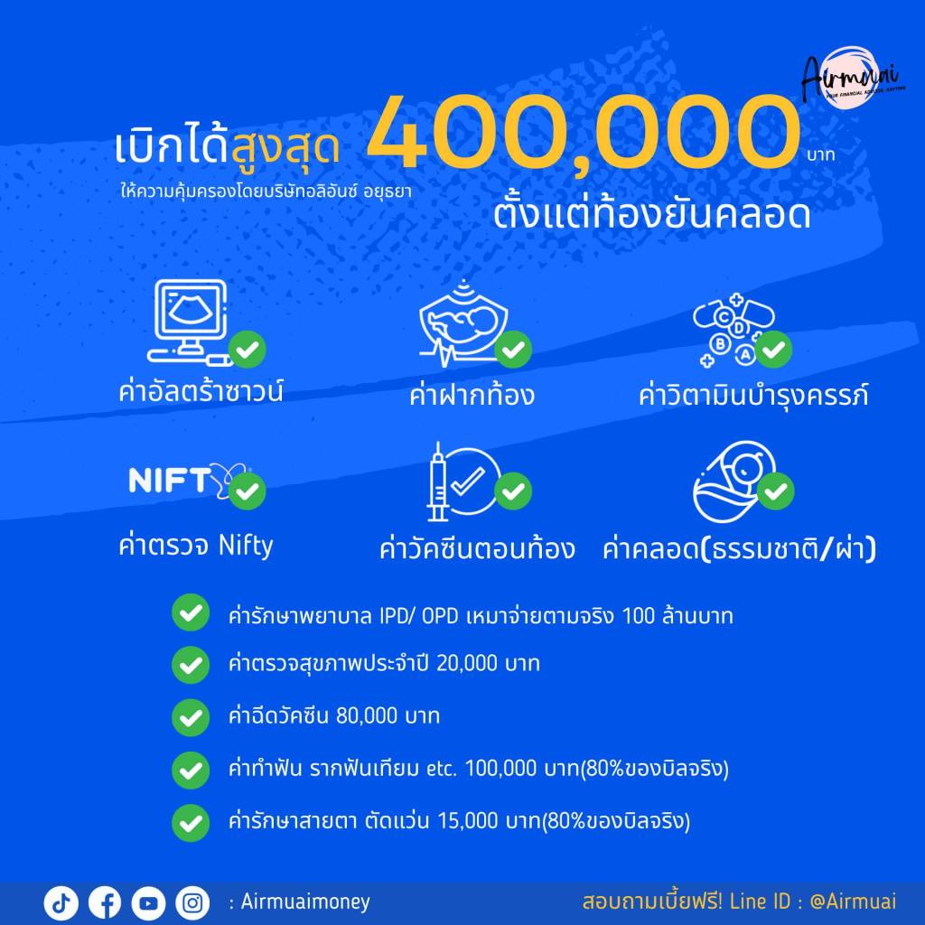 - ให้คุ้มครองสูงสุด 400,000 บาทสำหรับการผ่าคลอดและสูงสุด 200,000 บาทสำหรับการคลอดแบบธรรมชาติ